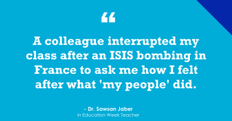 One example of a personal experience I have had was when a colleague interrupted my class after an ISIS bombing in France to ask me how I felt after what 鈥渕y people鈥 did. This incident took place in front of my students and took me by surprise. I wasn鈥檛 sure how to react since my students were witness to her racist interjection into our class lesson, so I stood there in shock.