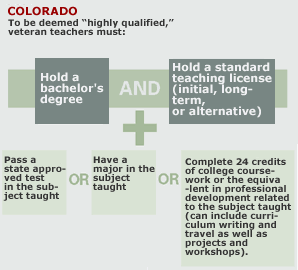 To be deemed 鈥渉ighly qualified,鈥 a Colorado classroom veteran has one option more than those available to a new teacher, who must either complete a college major or pass a test in the subject he or she teaches. The veteran can have the major, take the test, or accumulate 24 college credits or the equivalent in professional development in the relevant subject. That 24-credit rule falls six credits short of the state鈥檚 definition of a major. Still, it equals what the licensing system allows in the case of a teacher receiving a license 鈥渆ndorsement鈥 to teach a second subject.