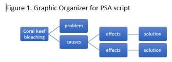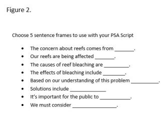 Writing for the general public requires knowledge of the science content being conveyed and it also requires expertise in content area literacy. As an approach, students can use many of the same general literacy skills that are taught across disciplines. Consider the following instructional practices used by Mr. Lopez, teacher of 9th grader, David, who has tasked his students with writing a Public Service Announcement script for a commercial warning about the bleaching of coral reefs in the Great Barrier Reef. To compose his PSA, David closely read three articles on the topic of reef bleaching, made annotations with each read, and engaged in lots of small group conversations around the readings. His teacher asked him and his classmates to create graphic organizers to set up their PSA text. Mr. Lopez then offered sentence frames to get them started (figure 2), and instructed them to make the PSA compelling and engaging. The goal was to inform and to inspire action on the part of the public. The skills needed and the subsequent instruction offered are content literacy strategies that cut across many disciplines. Reading complex texts several times, annotating, engaging in conversations around content, creating graphic organizers, and using sentence frames are all well-founded, research-based strategies that work well for science writing that is intended for a general public audience.