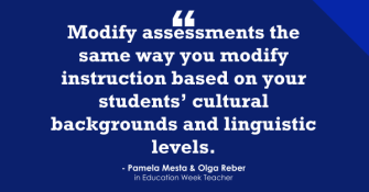 - Match instruction to assessment! Teach students how to be learners first before teaching and assessing content. Modify assessments the same way you modify instruction based on your students’ cultural backgrounds and linguistic levels. These modifications should be woven into all formative and summative assessments. The most important thing to remember is that grades should never be a direct reflection of language level, meaning that students should have the opportunity to do well regardless if they are newcomers or advanced ELLs. Oftentimes, this involves creating individualized, differentiated assessments. Provide clear rubrics for assessments and projects along with exemplars that can serve as models.